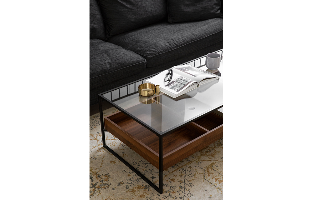 שולחן סלון המורכב ממסגרת מתכת עדינה בצבע שחור וזכוכית בשילוב מלמין בגוון אגוז אמריקאי או אלון טבעי.