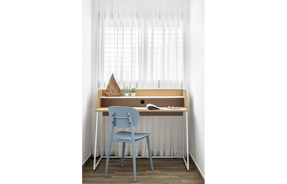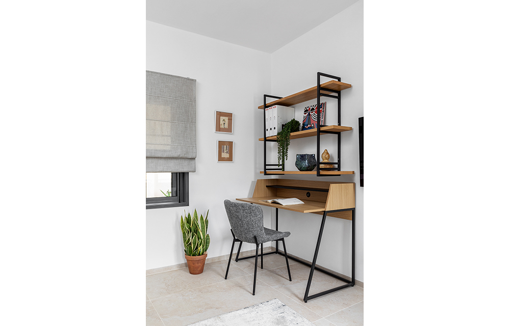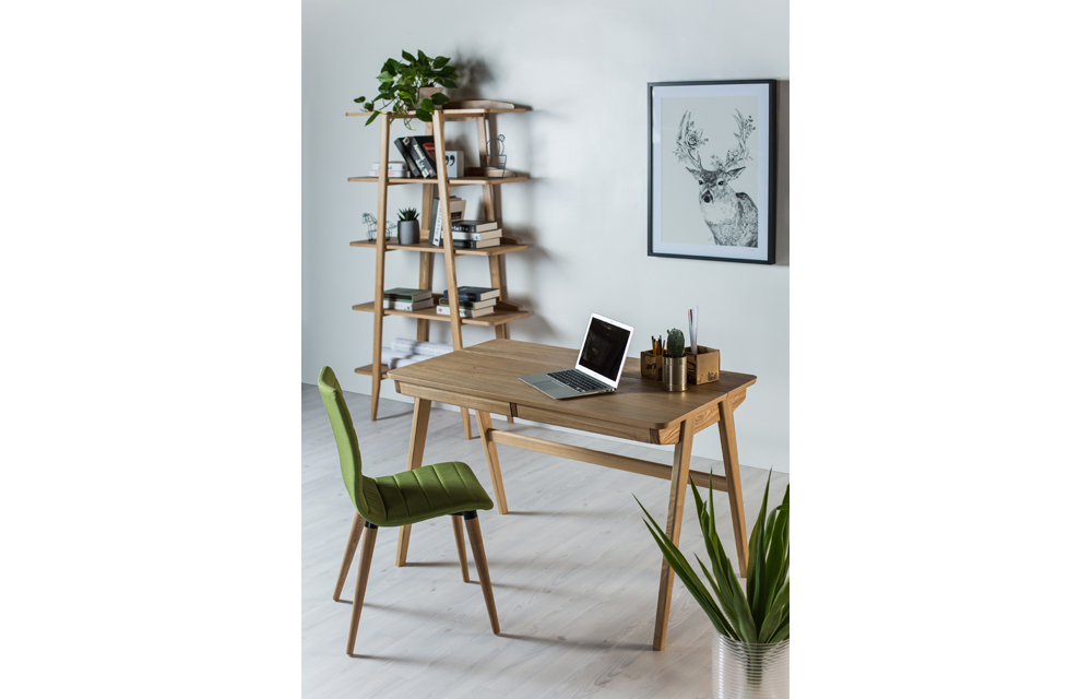 שולחן עבודה ביתי עם כוננית מובנה בגוון אלון טבעי עם רגלי מתכת לבנות. מתצוגת כ"ס