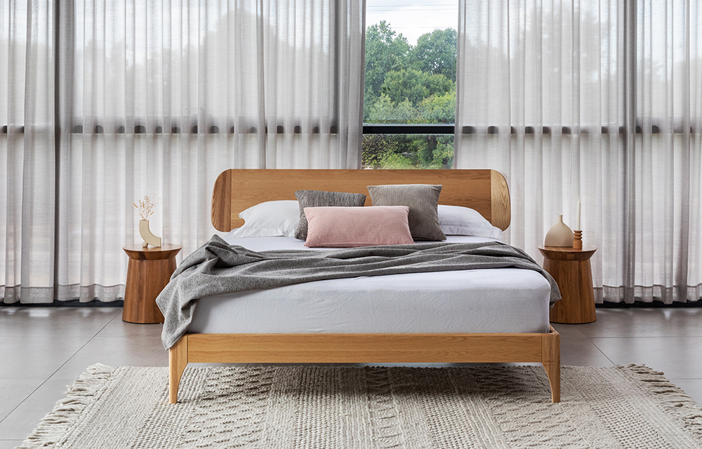 מיטה מעץ אלון מלא בשילוב פורניר אלון, בדיגום קלאסי עם קימורים מעודנים בראש ובחזית המיטה (למזרן בגודל 180/200) מתצוגת כ"ס