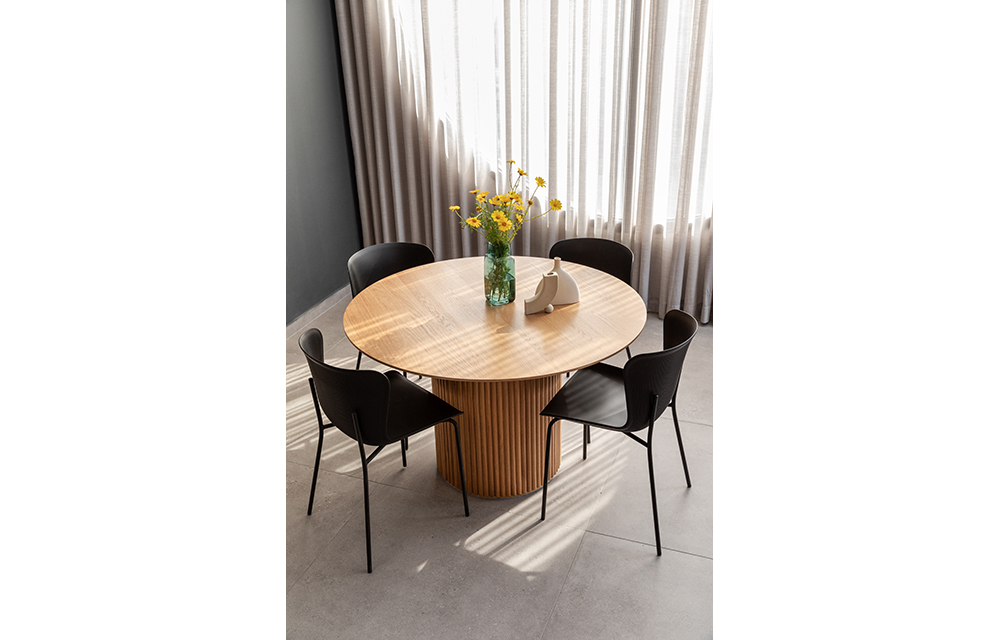 שולחן אוכל עגול קומפקטי בעיצוב נקי ומנימליסטי, בגוון אלון טבעי. מתצוגת כ"ס