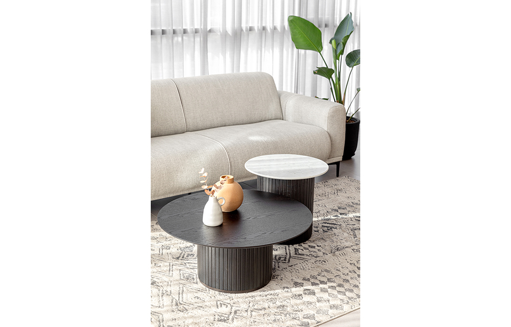 סט שולחנות סלון בגוון אלון מולבן (גדול: 62/43h קטן: 42/52h) . פריטים אחרונים מעודפים ותצוגות