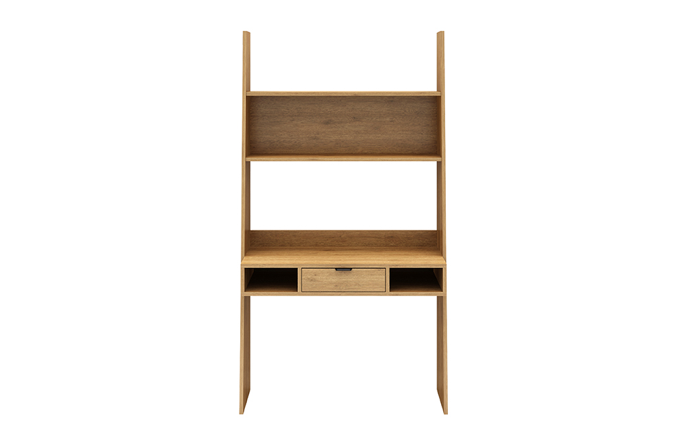 שולחן עבודה ביתי עם כוננית מובנה בגוון אלון טבעי עם רגלי מתכת שחורות. מתצוגת כ"ס