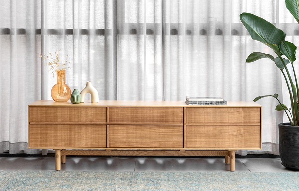 מזנון בדיגום מנימליסטי המאופיין בדוגמת פורניר אלון מוברש ופסי עץ. בגודל 180 ס"מ. מתצוגת כ"ס