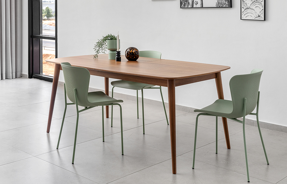 שולחן אוכל נפתח במראה נורדי קליל בגוון אגוז. גודל 180/100 (פתיחה מקסימלית 260 ס"מ) מתצוגת כ"ס