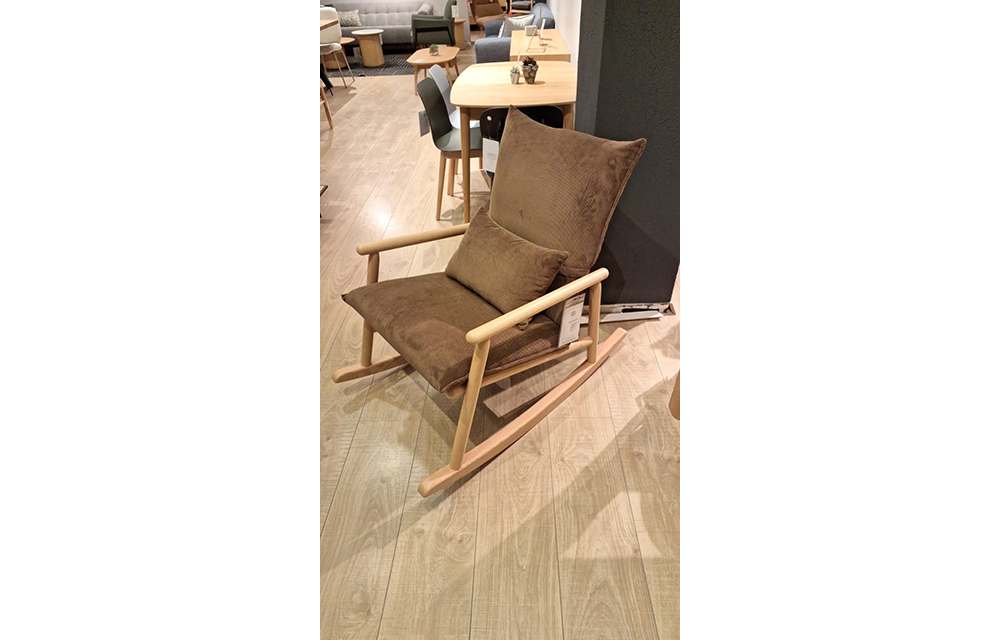 כורסת נדנדה בבד קורדוריי חום. מתצוגת דיזיין סנטר (בני ברק)
