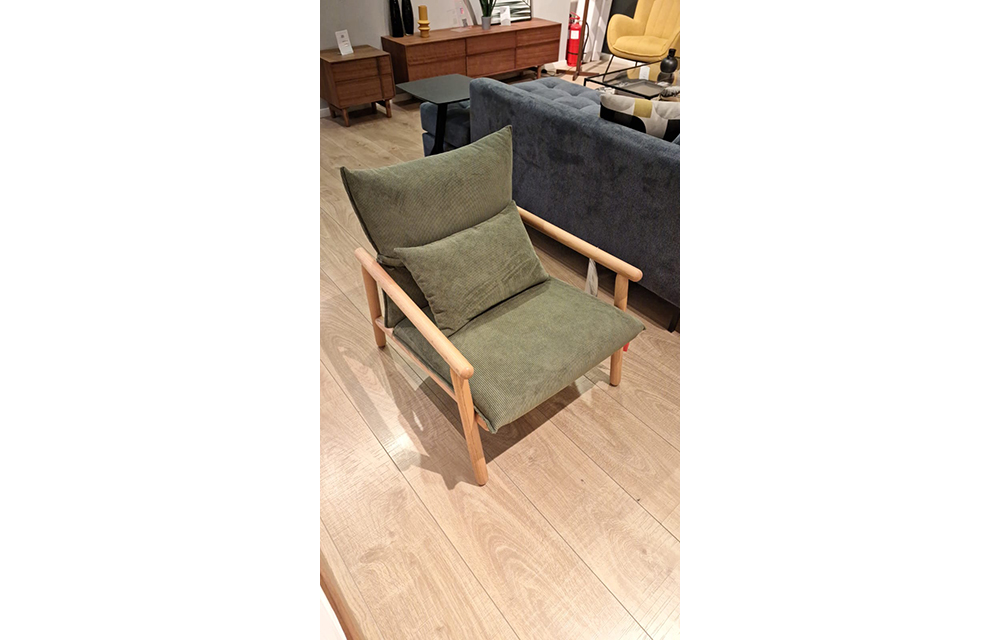 כורסא בגוון אלון טבעי בשילוב כריות קורדוריי ירוק. מתצוגת דיזיין סנטר (בני ברק)