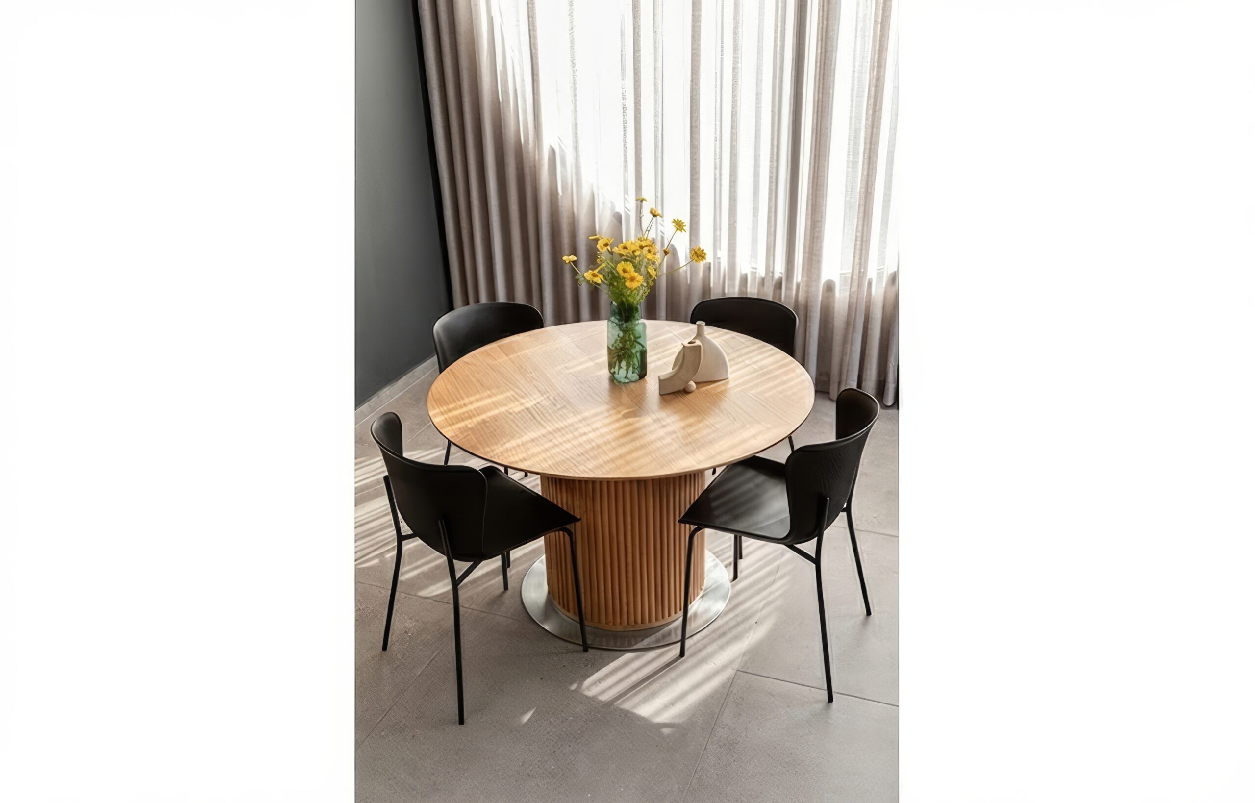 שולחן אוכל עגול מעץ אלון עם רגל מרכזית עגולה מחורצת. *מחיר מבצע לפריטים אחרונים מעודפי מלאי ותצוגות*