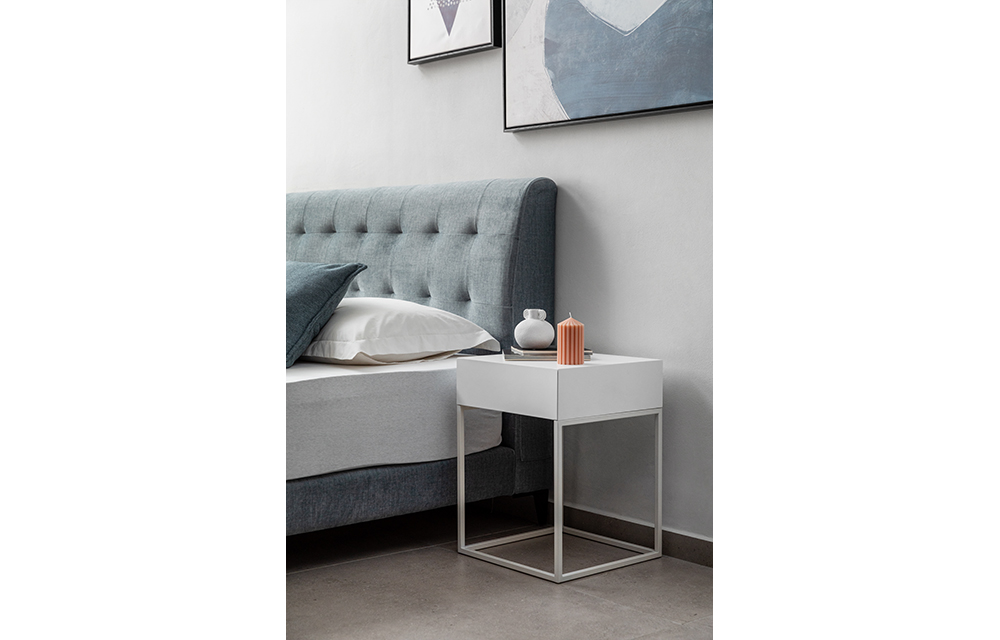 שידת לילה ממתכת לבנה בשילוב מגירה לבנה ורגלי מתכת לבנות