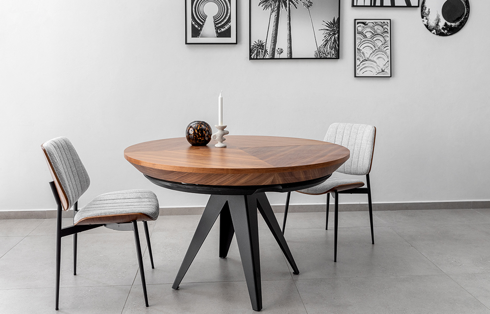 שולחן אוכל עגול נפתח בקוטר 120 ס"מ בגוון אגוז אמריקאי (פתיחה מקסימלית 216 ס"מ ). מתצוגת ראשל"צ