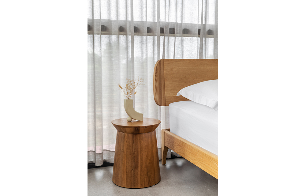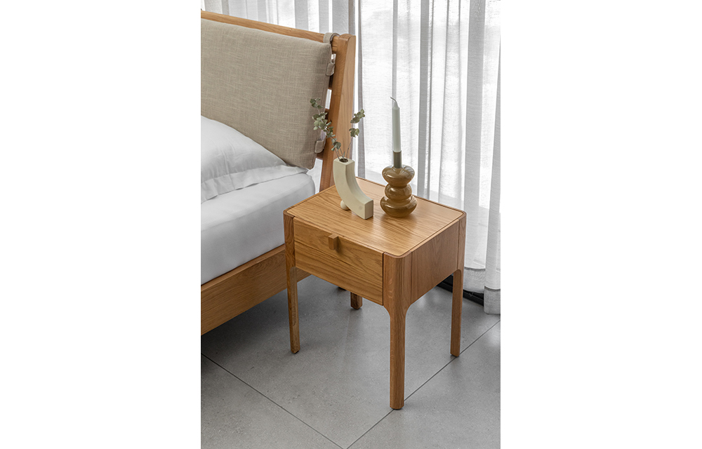 שידת לילה הכוללת מגירה, מעץ אלון פראי בקימורים עדינים ומעגולים מתצוגת כ"ס