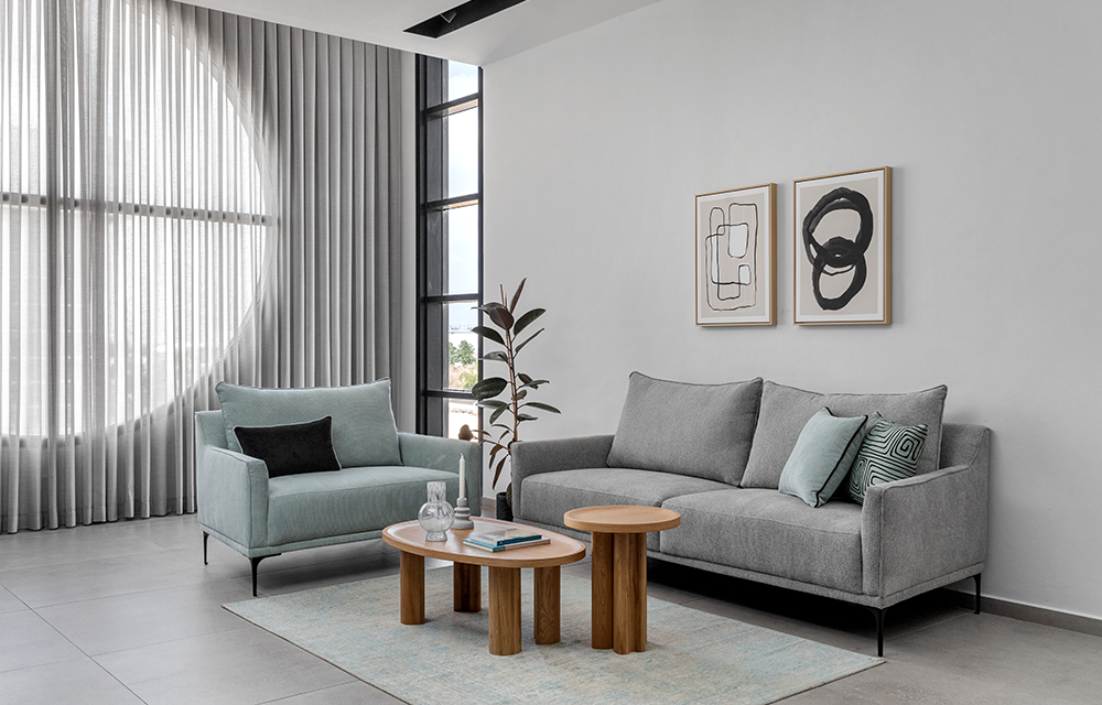 ספה תלת מושב בגודל 230 ס"מ בגוון אפור. מתצוגת כ"ס
