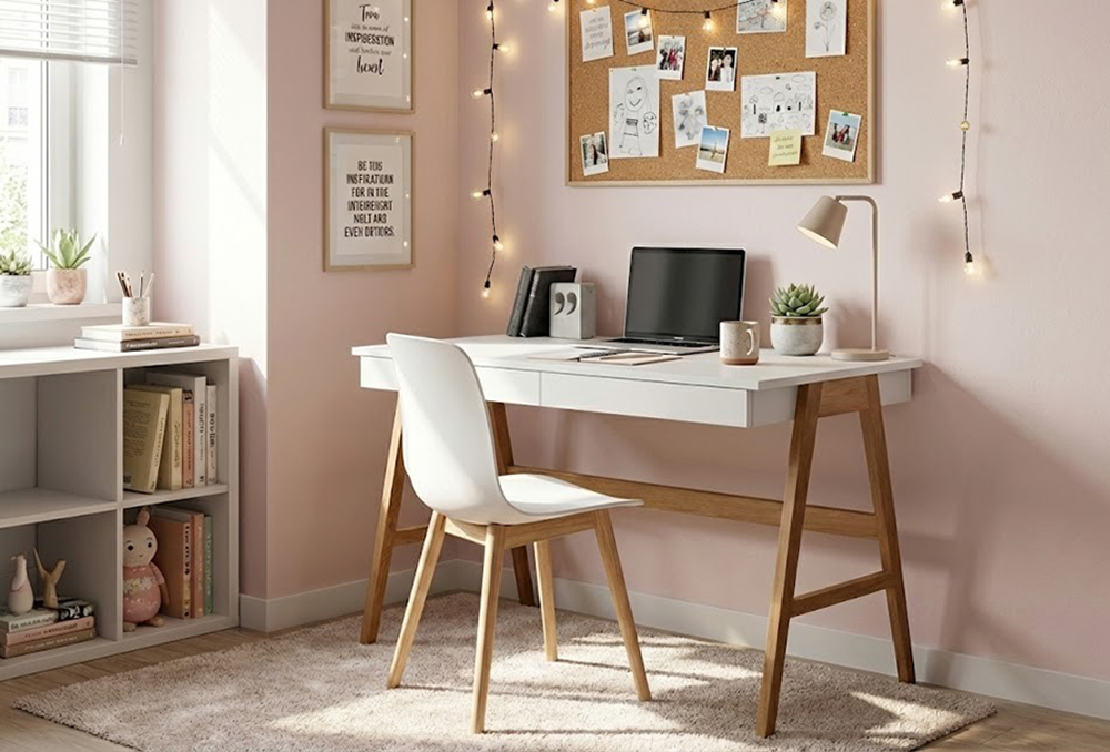 שולחן עבודה בגוון לבן מט בשילוב רגליים מאלון טבעי עם 2 מגירות. מתצוגת כ"ס