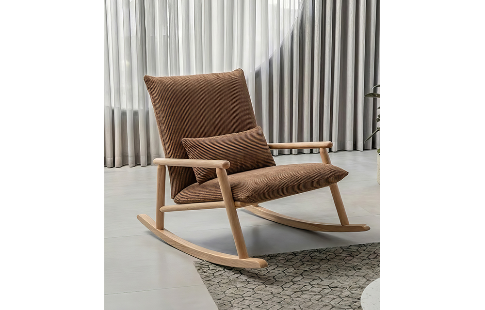 כורסת נדנדה בבד קורדוריי חום. מתצוגת דיזיין סנטר (בני ברק) וראשל"צ
