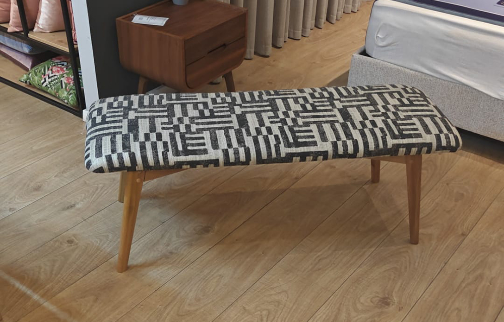 ספסל מרפד בדוגמא גיאומטרית עם רגלי עץ אלון טבעי. מתצוגת דיזיין סנטר (בני-ברק)