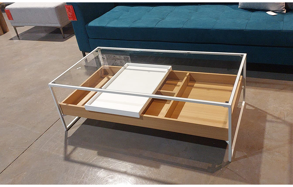 שולחן סלון בגודל 120 ס"מ בגוון אלון טבעי בשילוב מתכת לבנה. מתצוגת כ"ס