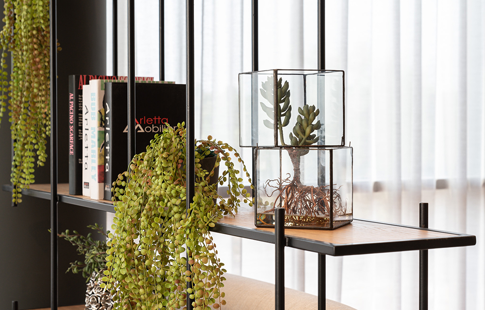 ספרייה ייחודית בגוון פורניר אלון טבעי בשילוב מתכת שחורה. מסופק מורכב, יש לוודא גישה.