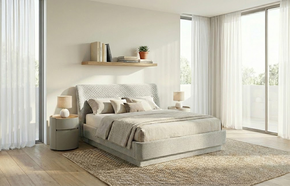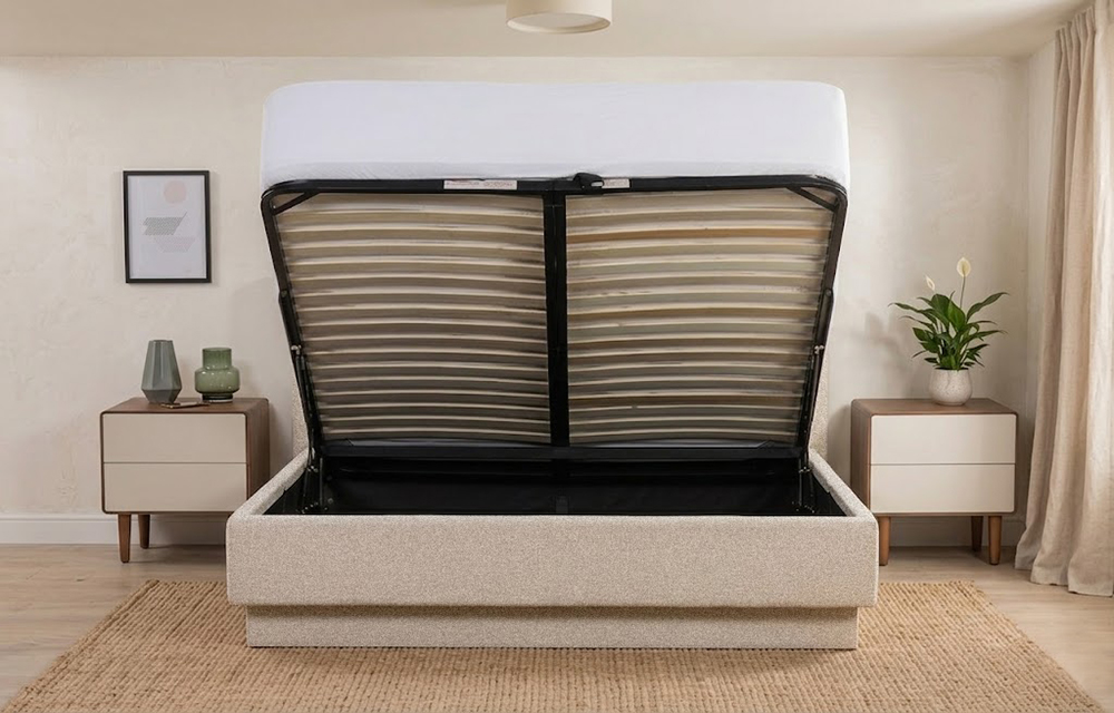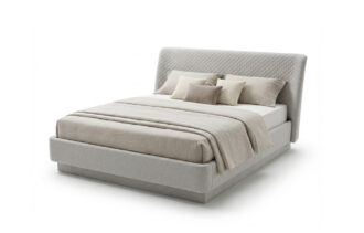 מיטה מרופדת עם גב מפנק בדוגמת קויילט מעויינים הכוללת ארגז מצעים רחב, בבד ריפוד אפור.