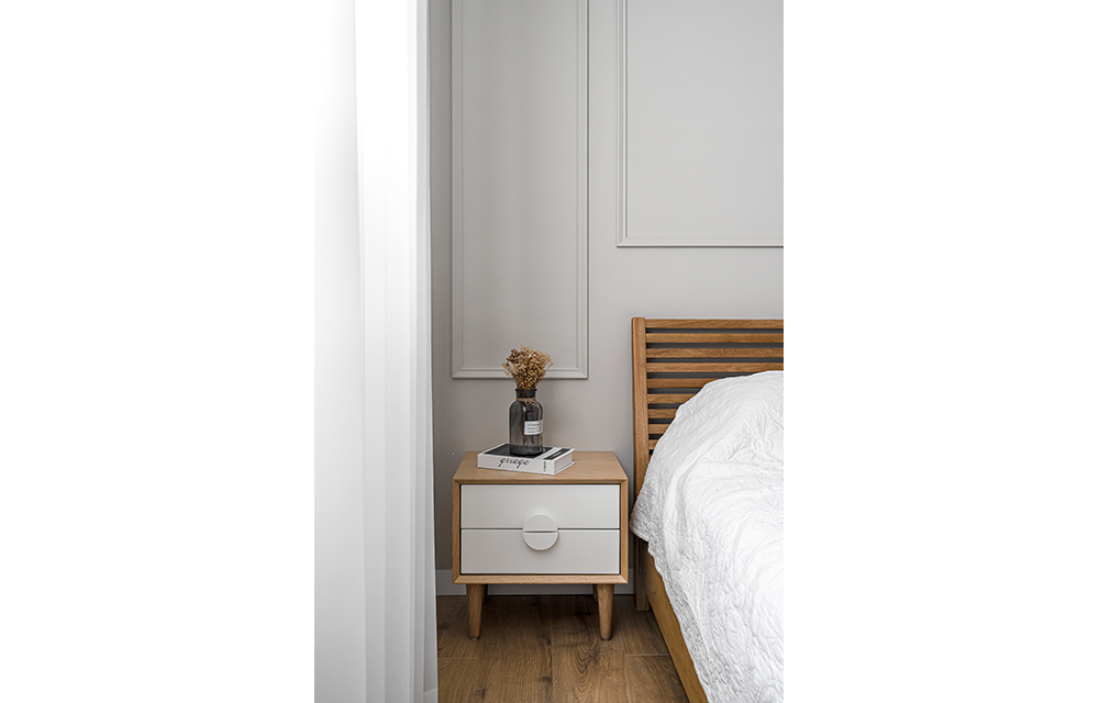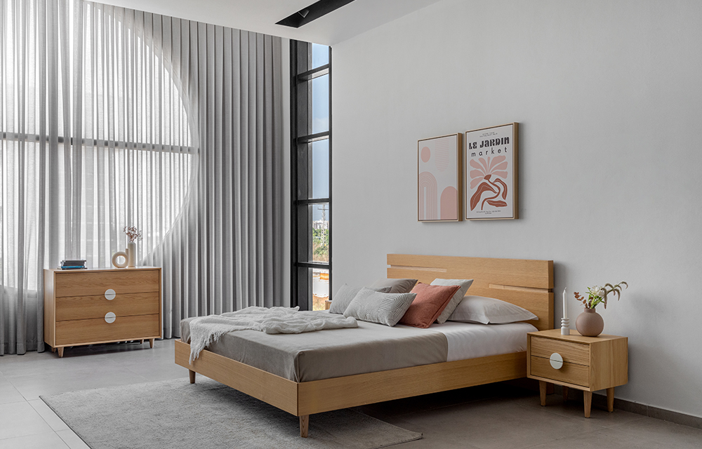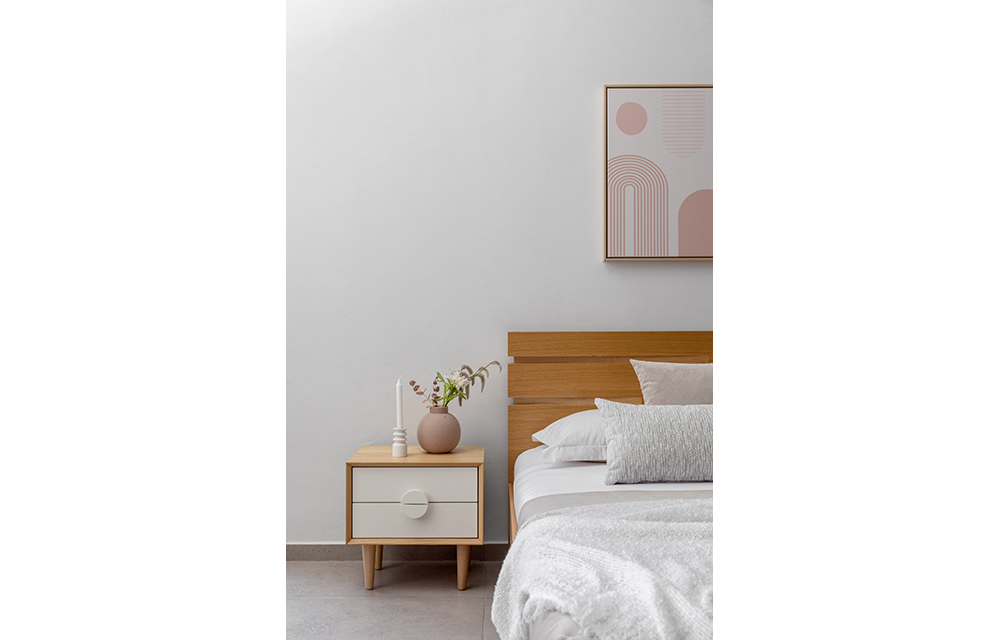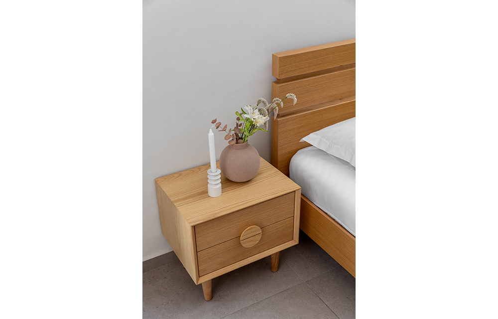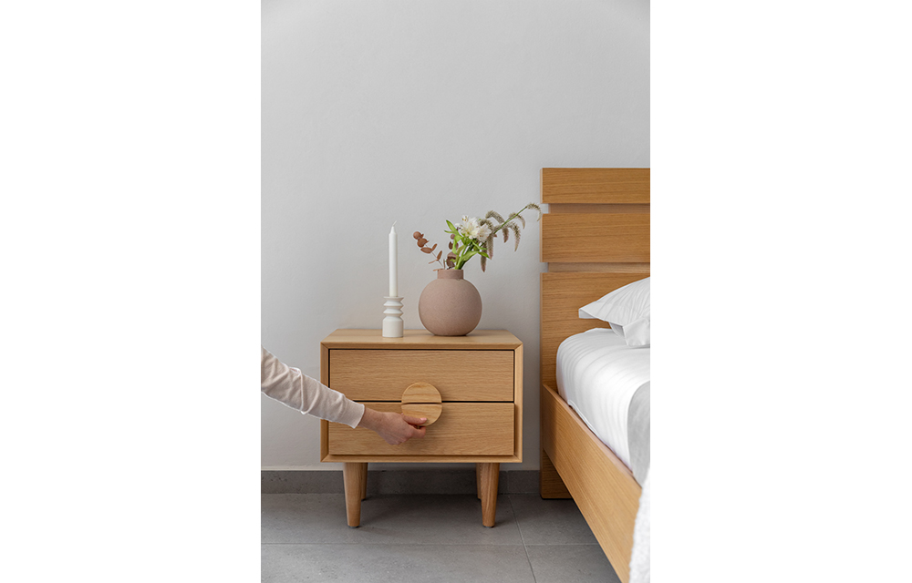 שידת לילה הכוללת 2 מגירות וידית דקורטיבית עגולה. ב-3 גוונים לבחירה