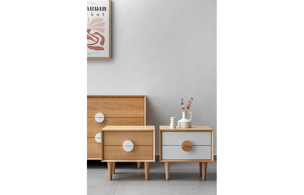 שידת לילה בעיצוב מודרני הכוללת 2 מגירות וידית עגולה. זמינה ב 3 וריאציות: גוון אלון עם חזית לבנה וידית לבנה/ שידה שבמלואה גוון אלון טבעי עם ידית בגוון אלון טבעי/ גוון אגוז עם חזית אגוז וידית אגוז.
