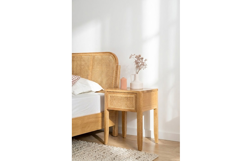 שידת לילה מעץ אלון מלא בשילוב ראטן טבעי.