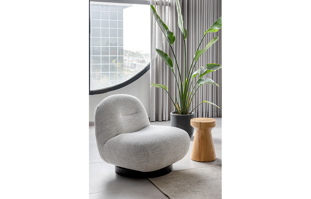 כורסא מסתובבת על ציר, בקווים מעוגלים במבחר בדי ריפוד ממלאי או בבחירה אישית.