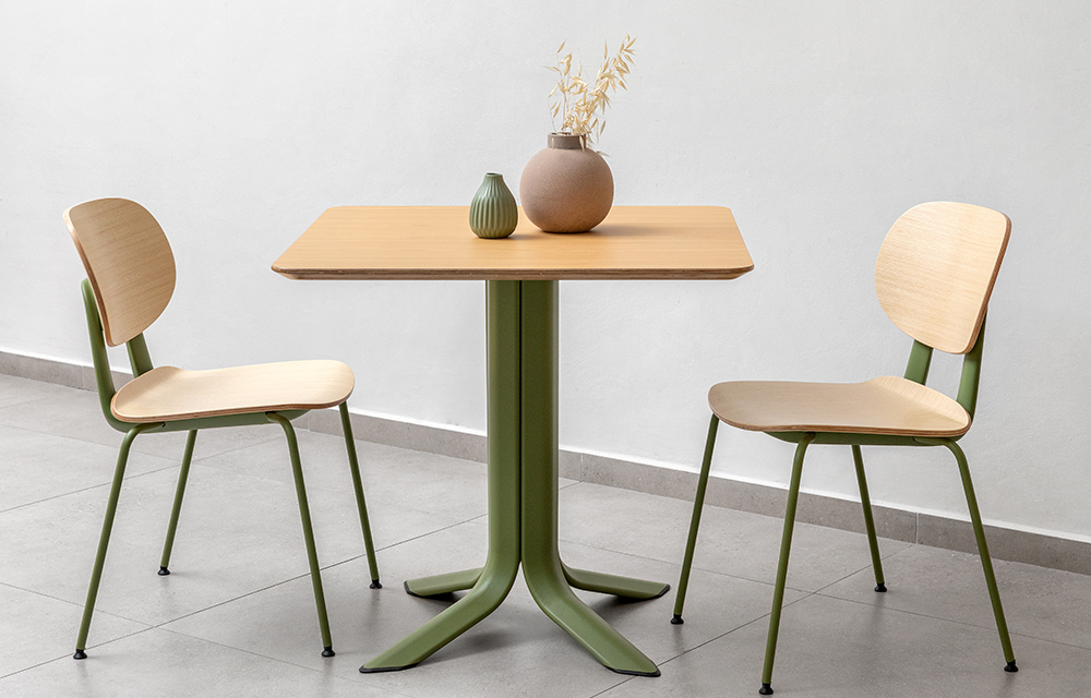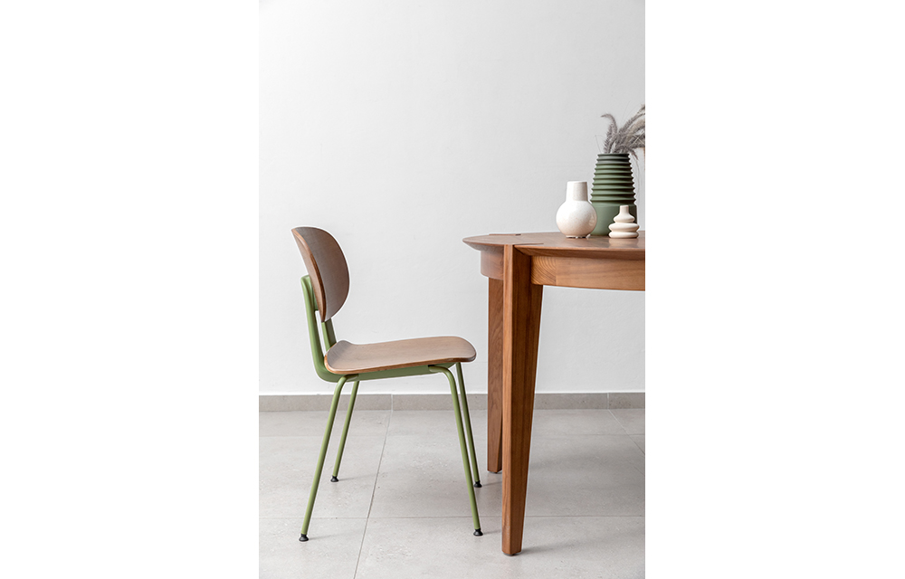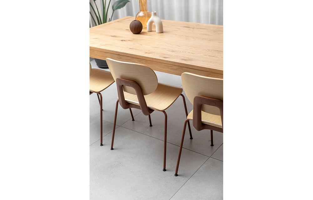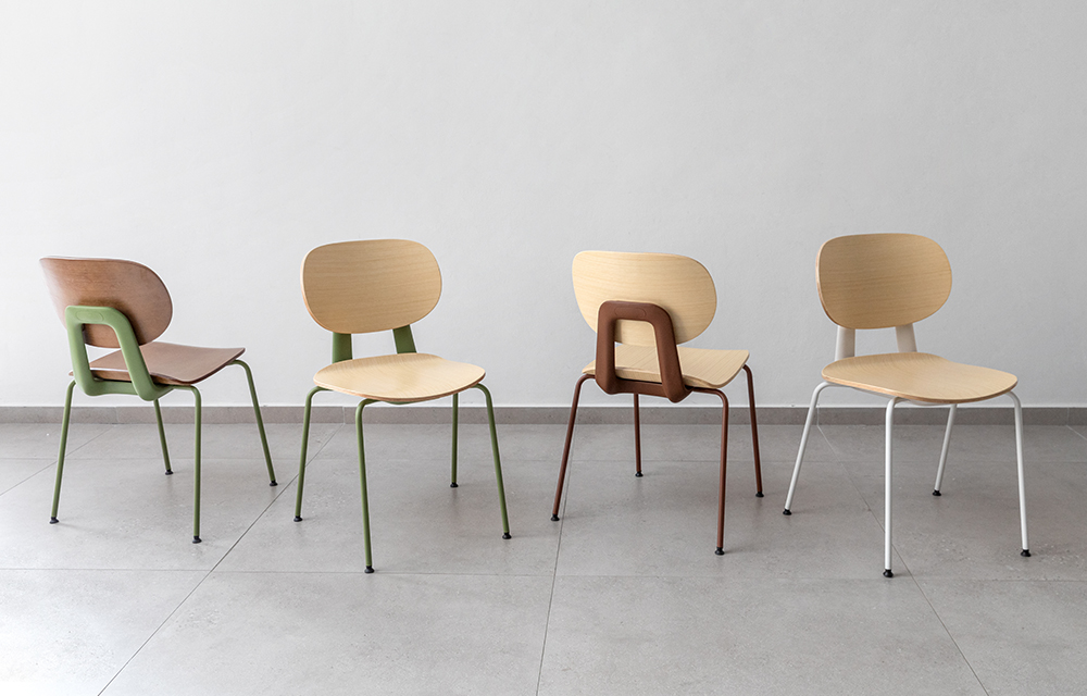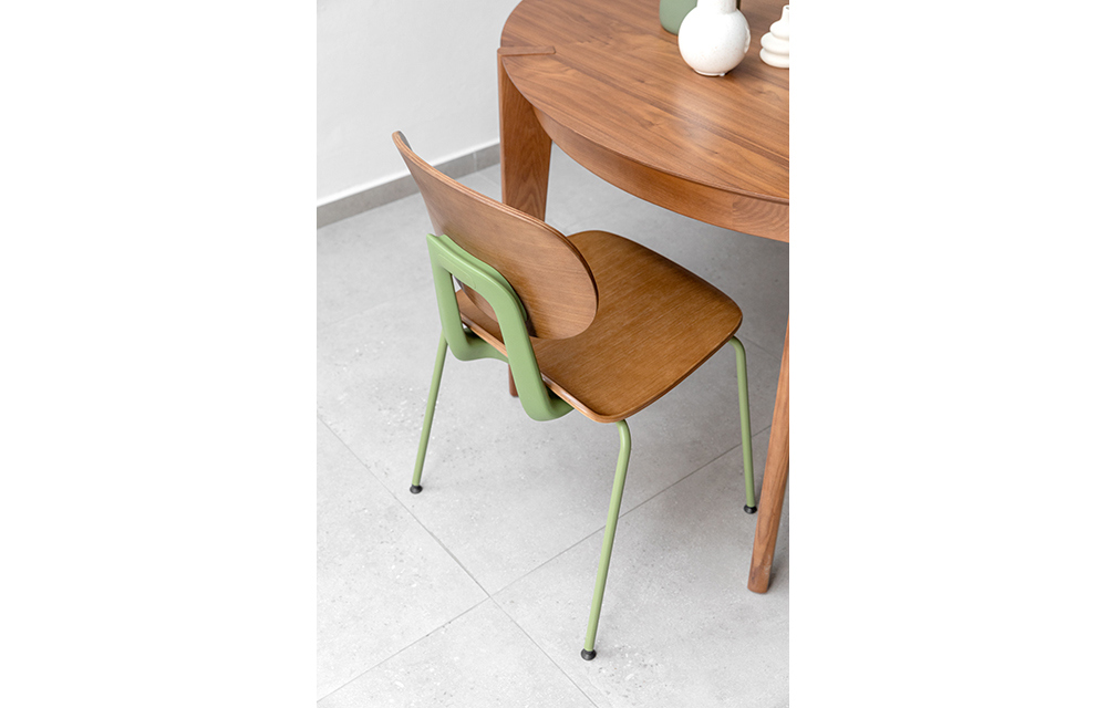 כיסא עם מושב ומשענת עשויים עץ בגימור טבעי ורגלי מתכת במגוון צבעים