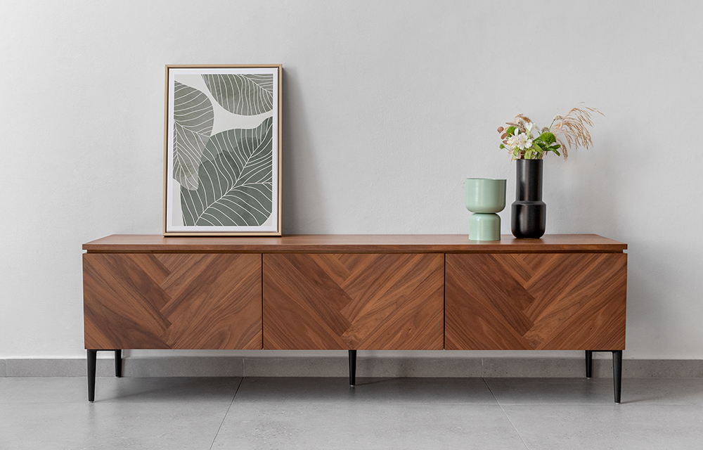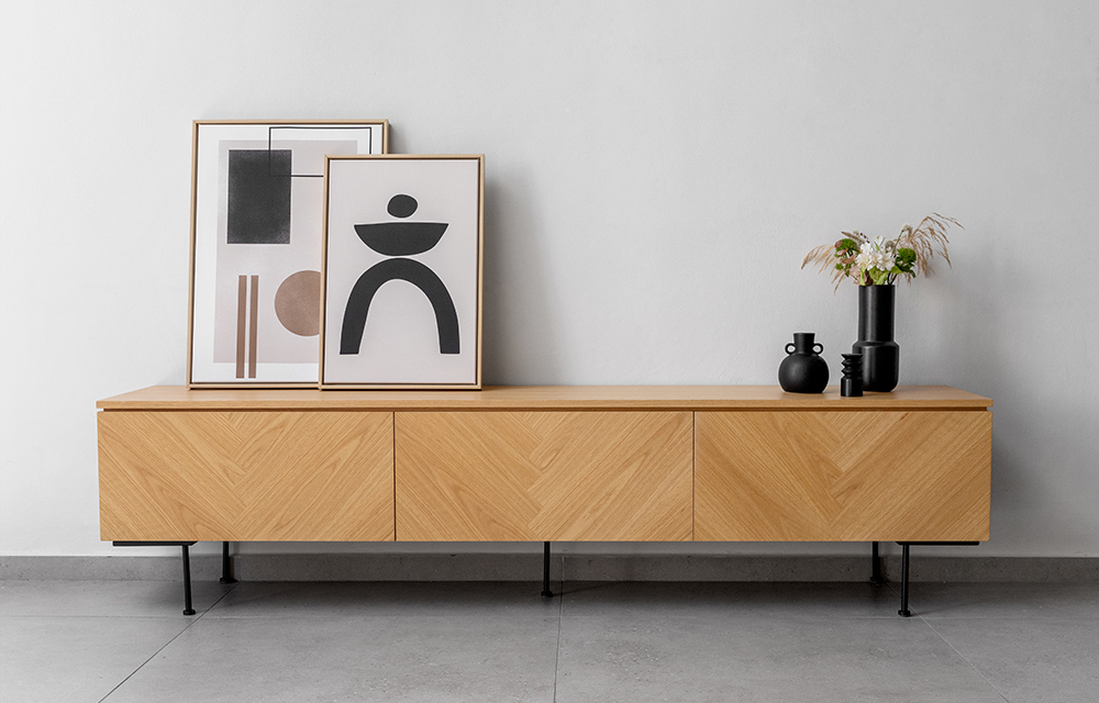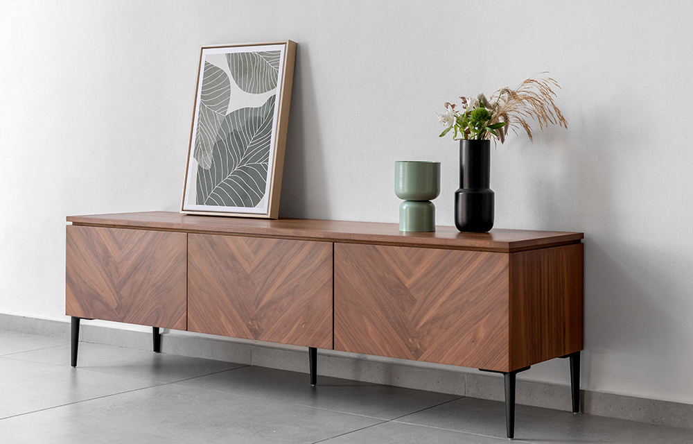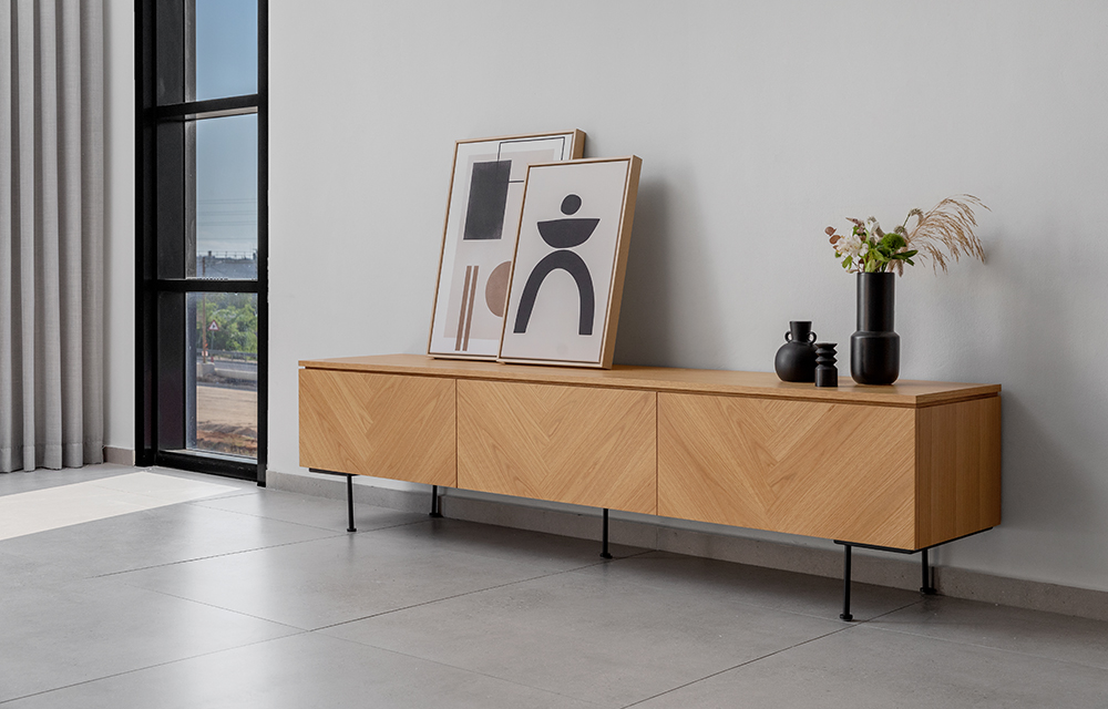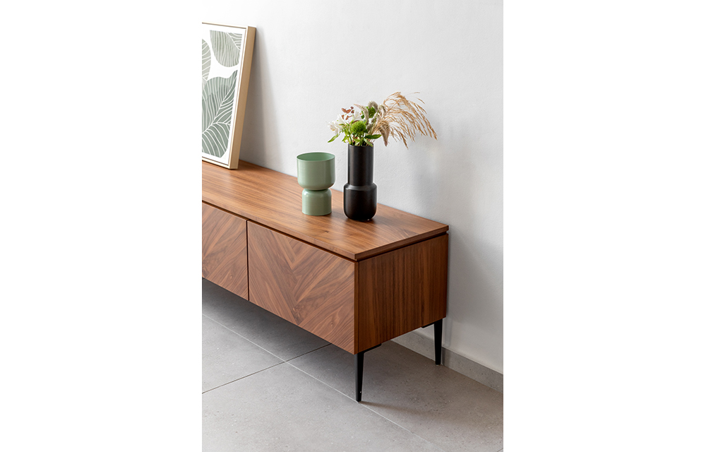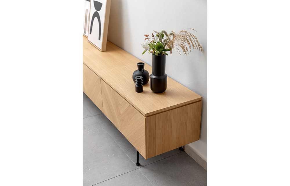 מזנון מעץ אלון או אגוז עם דוגמת פישבון בגימור טבעי ופראי במגוון טקסטורות משתנות, עם 2 מגירות וקלפה אמצעית עבור ממירים לטלוויזיה. נמכר באפשרות לתליה על קיר בלוקים ללא רגליים, או עם רגליים בתוספת מחיר.