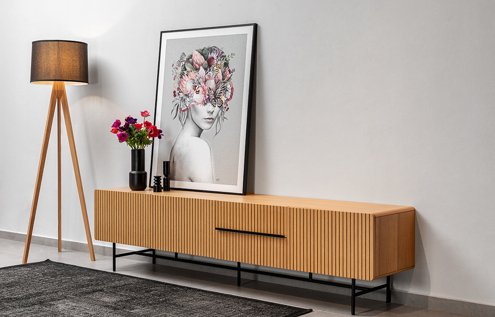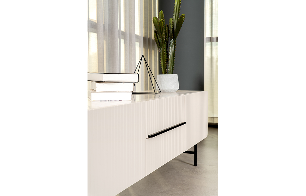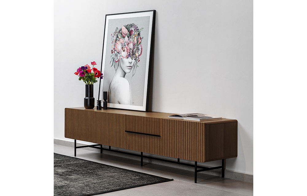 מזנון מחורץ בעיצוב מודרני מעוגל, בשילוב רגלי מתכת שחורות. קיים בשלושה גוונים, פורניר אבן, פורניר אלון ואגוז. ב-2 מידות לבחירה: 220 ס"מ או 172 ס"מ.