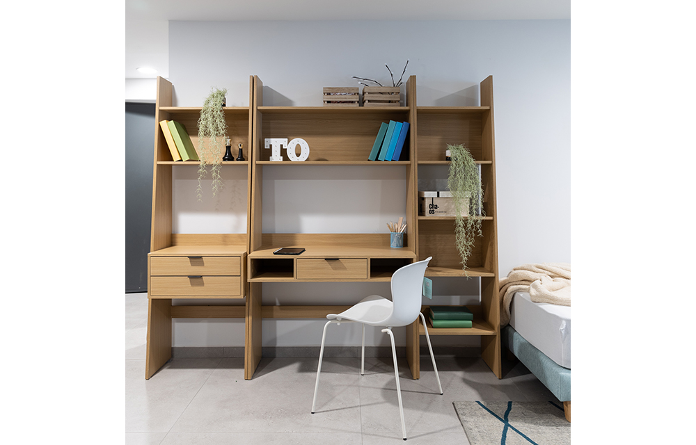 ספרייה מודולרית הכוללת שלוש יחידות: יחידת מדפים, יחידת מגירות ויחידת שולחן עבודה. היחידה עשויה מלמין בגימור אלון טבעי. ( נותרו יחידות בודדות אחרונות של שולחן עבודה)