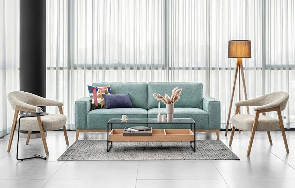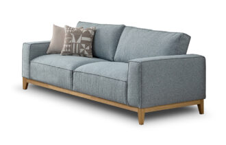 ספה תלת מושב מודרנית ונוחה, עם מסגרת ורגלי עץ ייחודיות. בגוון אפור/ טורקיז ממלאי .או בבחירת בד אישית.