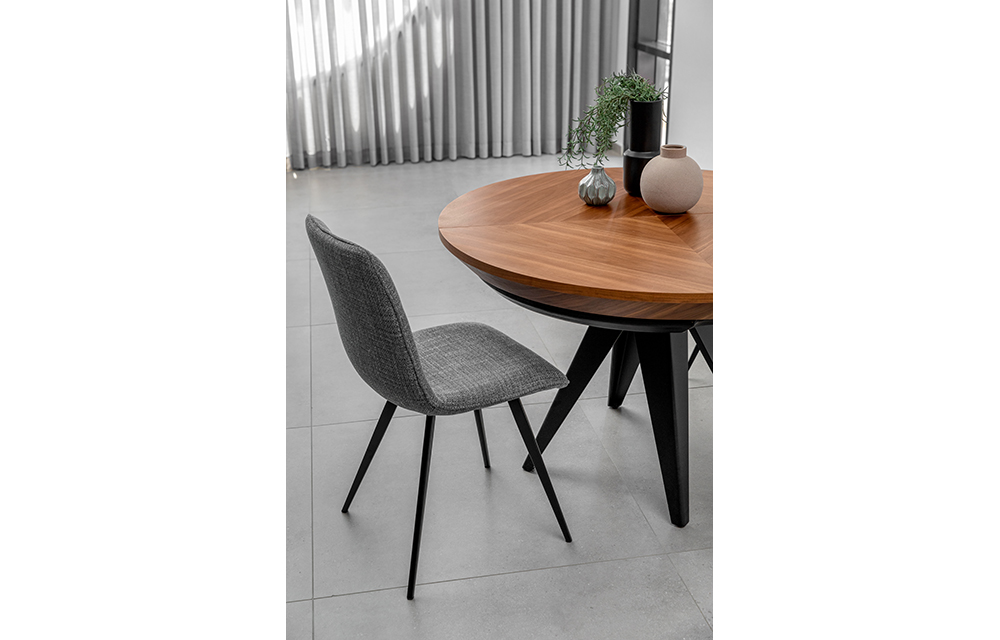 שולחן אוכל עגול נפתח, בעל 2 הארכות פנימיות. עשוי מפורניר אלון טבעי או פורניר אגוז בשילוב רגלי מתכת שחורה. ב-2 גדלים לבחירה