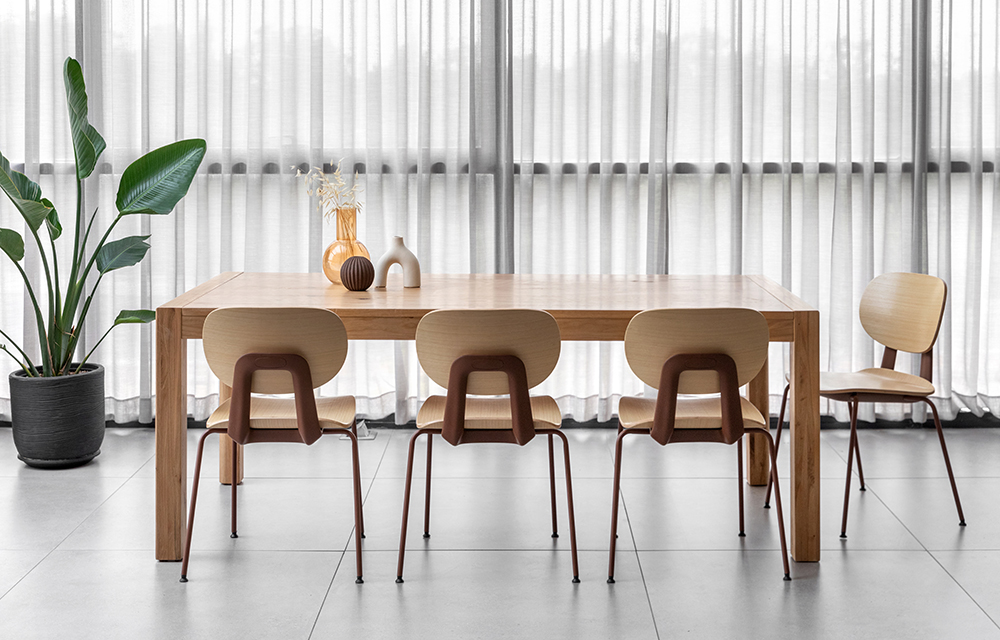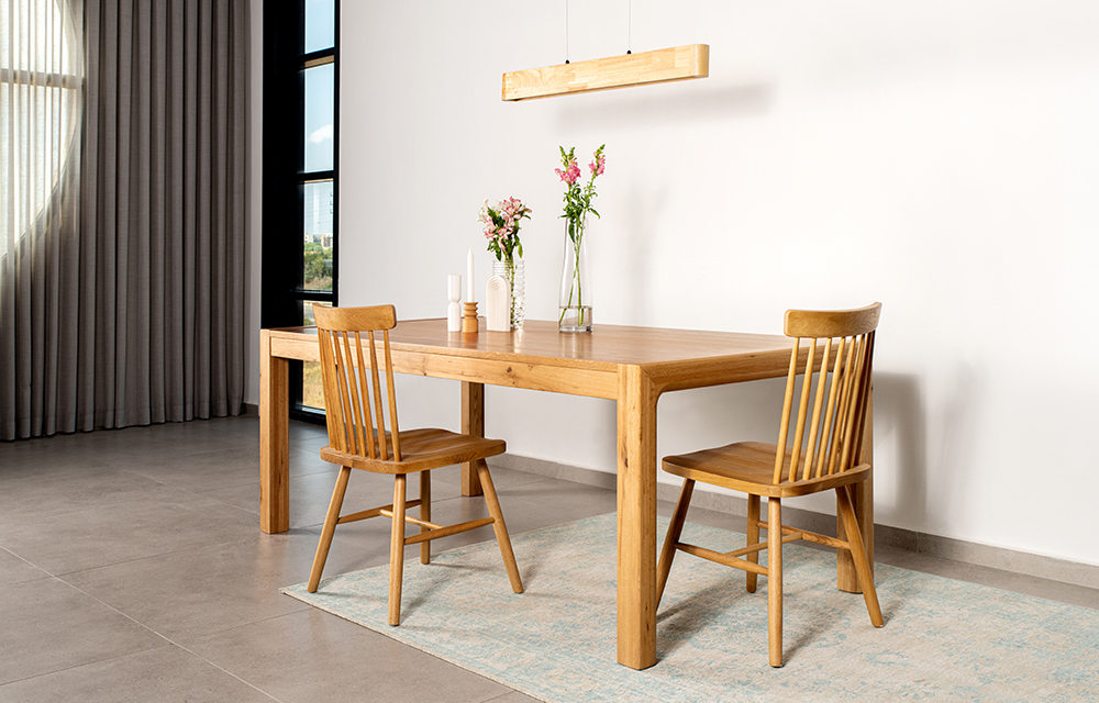 שולחן אוכל מלבני נפתח מעץ אלון טבעי, פראי ומבוקע. בפתיחה אחת פשוטה עם ציר פרפר. ב 2 מידות לבחירה