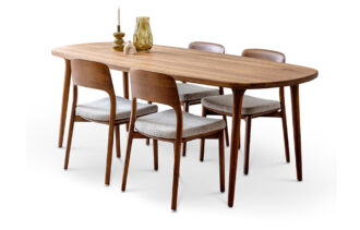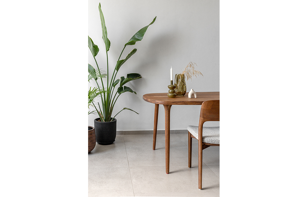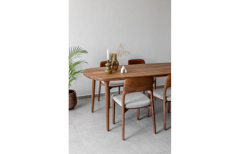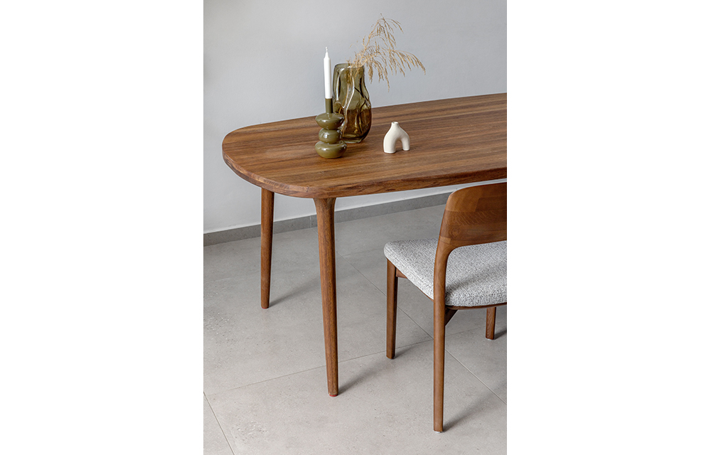 שולחן לפנים ולחוץ הבית. שולחן אוכל מעץ אנג'ליק מלא בגוון אגוז אדמדם, בעיצוב סקנדינבי עם פלטה אובלית ורגליים אלגנטיות בקווים אורכיים. השולחן עמיד לתנאי חוץ ומעובד בגימור טבעי וגולמי המשוח בשמן טיק טבעי לשמירה על המראה לאורך זמן.