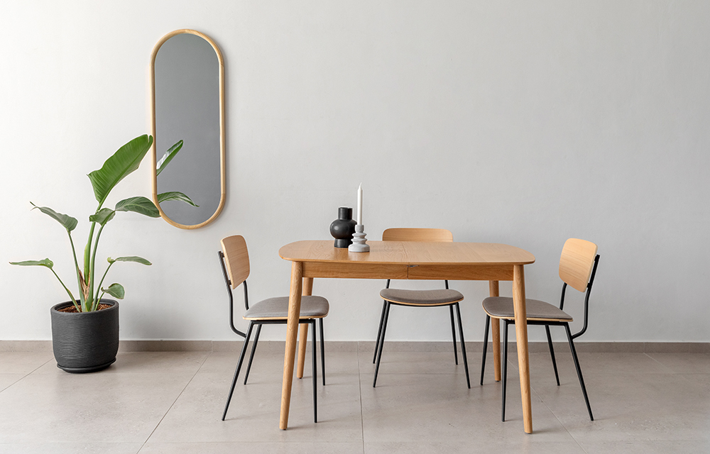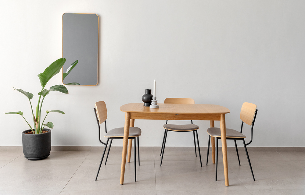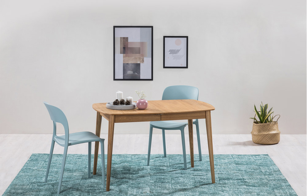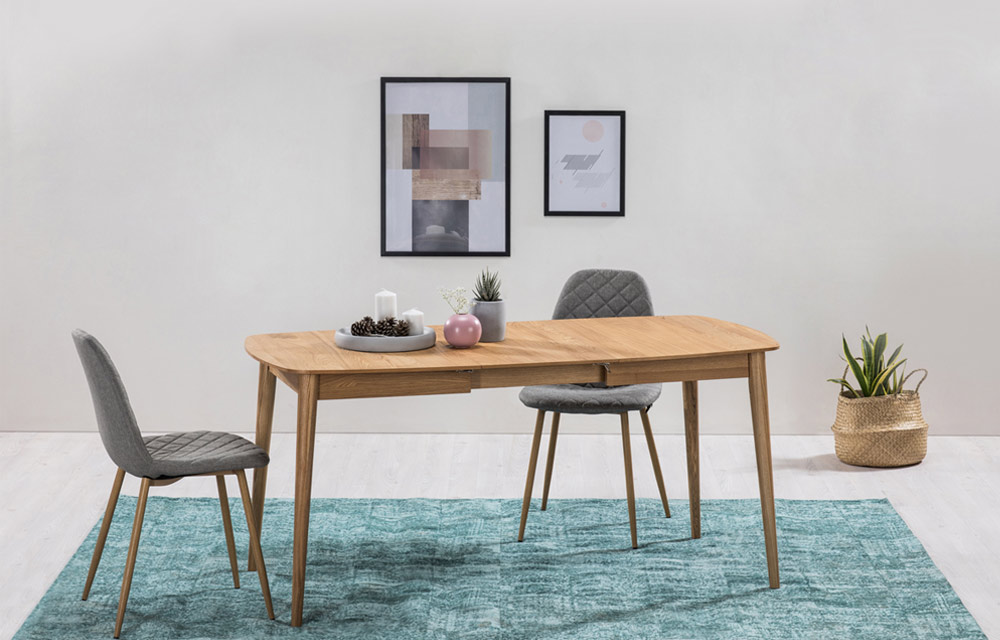 שולחן אוכל קומפקטי נפתח (פתיחת פרפר), מראה נורדי קליל. מעץ אלון מלא בשילוב פורניר.