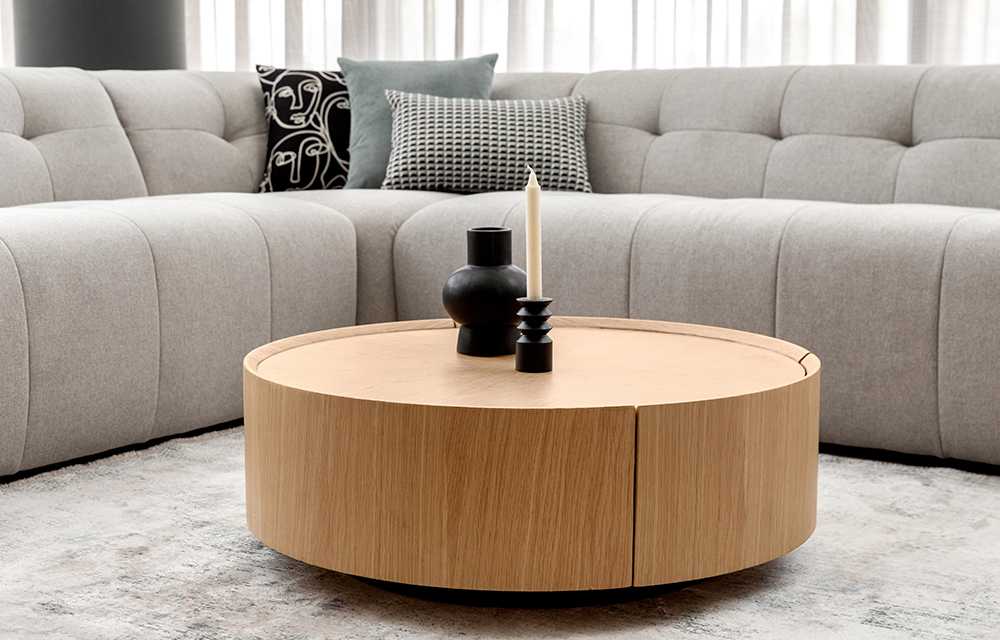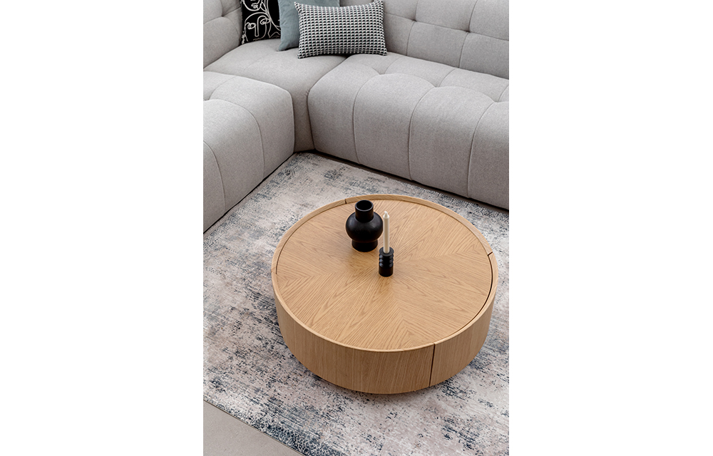 שולחן סלון עגול בעיצוב אלגנטי עם 2 מגירות נפתחות. בגוון אלון טבעי/ אגוז