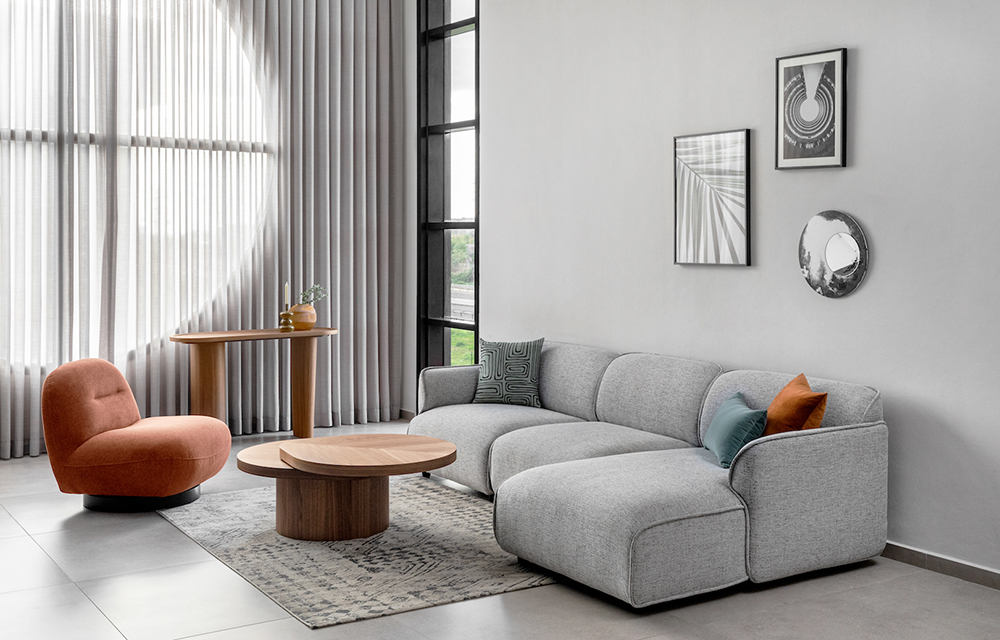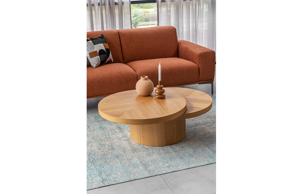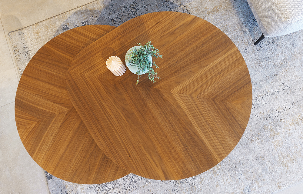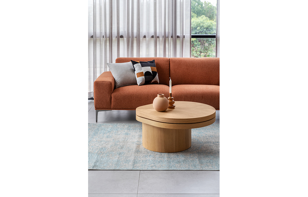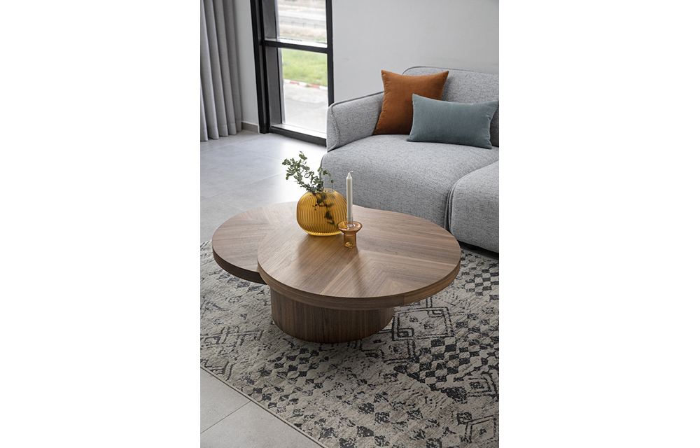 שולחן סלון מפורניר אלון/ אגוז עם טופ נפתח בסיבוב ורגל מרכזית עגולה.