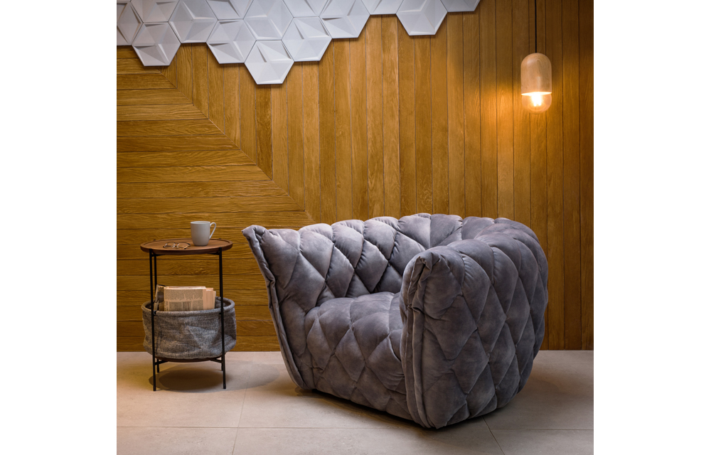 שולחן צד עגול, מתכת ומגש באגוז בשילוב סלסלת בד לאחסון.