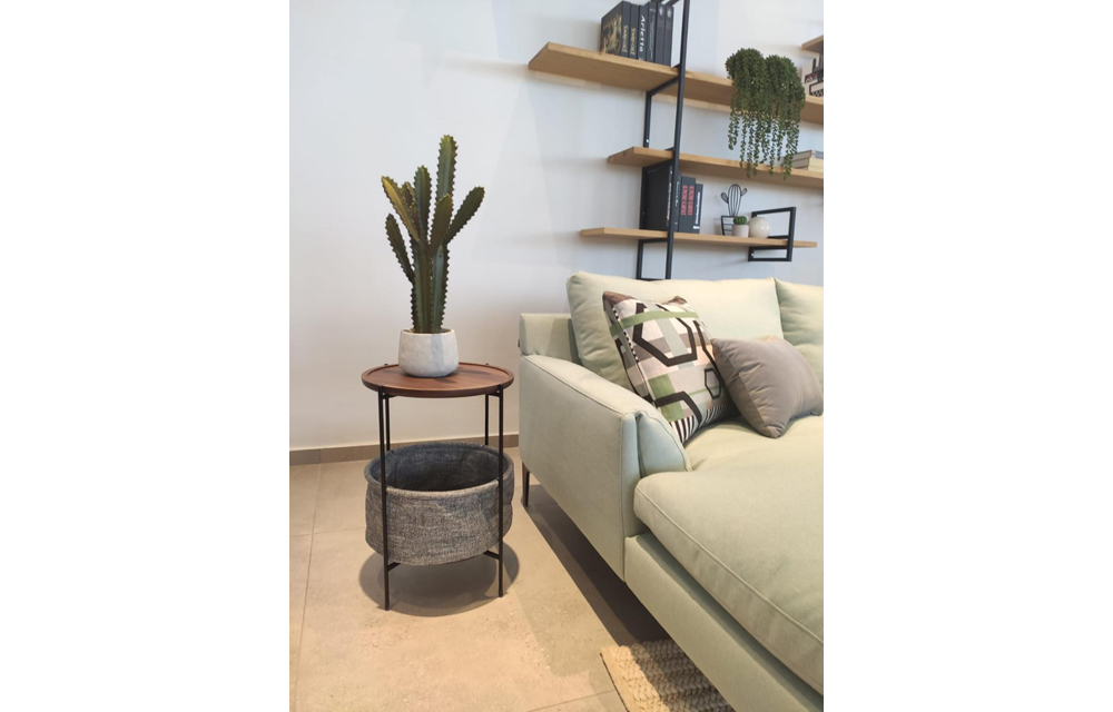 שולחן צד עם מגש אגוז וסלסלת בד