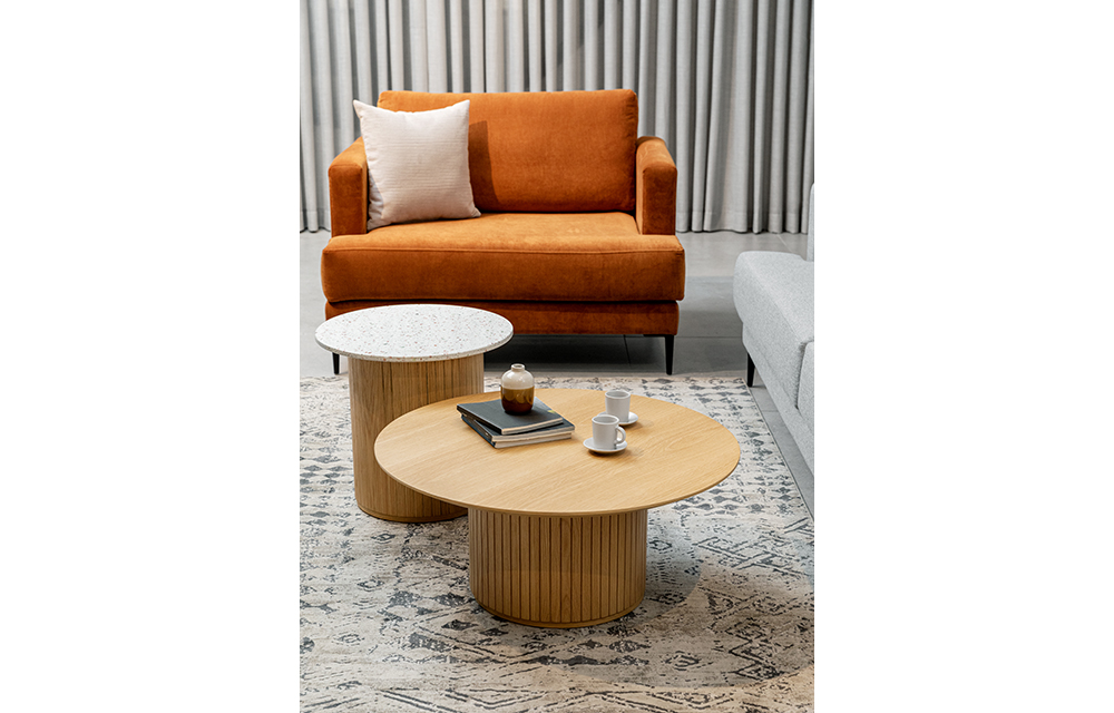 שולחן סלון ושולחן צד עגול מעץ אלון עם רגל מרכזית מחורצת, בגוון אלון טבעי .*פריטים אחרונים מעודפי מלאי AS-IS*