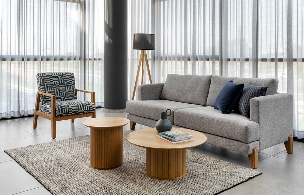 שולחנות סלון עגולים מעץ אלון עם רגל מרכזית מחורצת