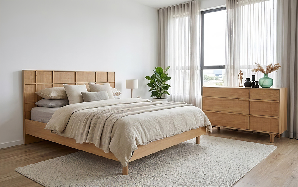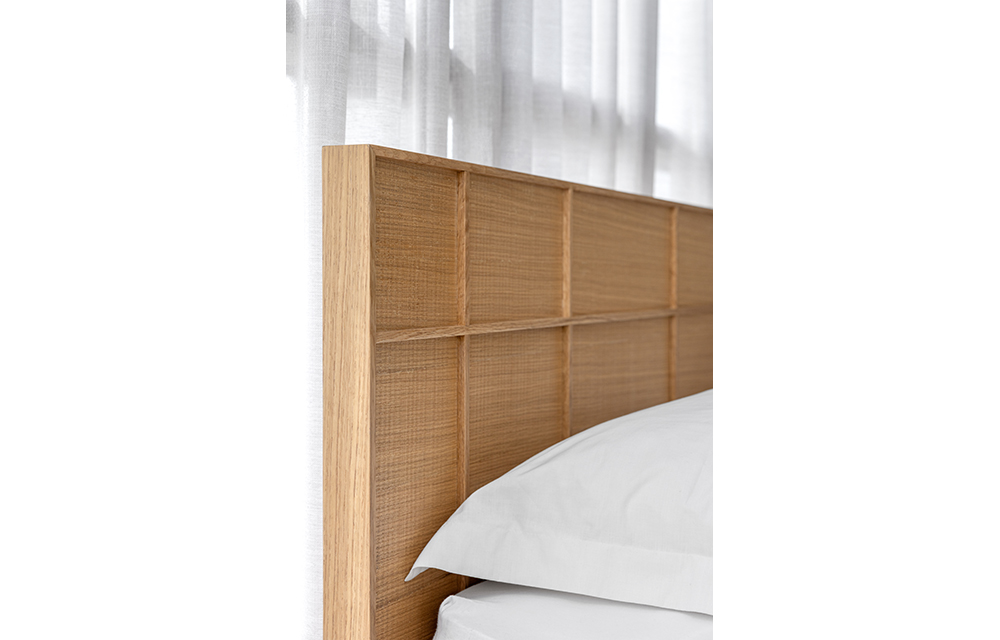 מיטה בעיצוב מינימליסטי בגוון אלון טבעי בקווים נקיים, עם ראש מיטה בדוגמת פורניר אלון מוברש עם פסי עץ.