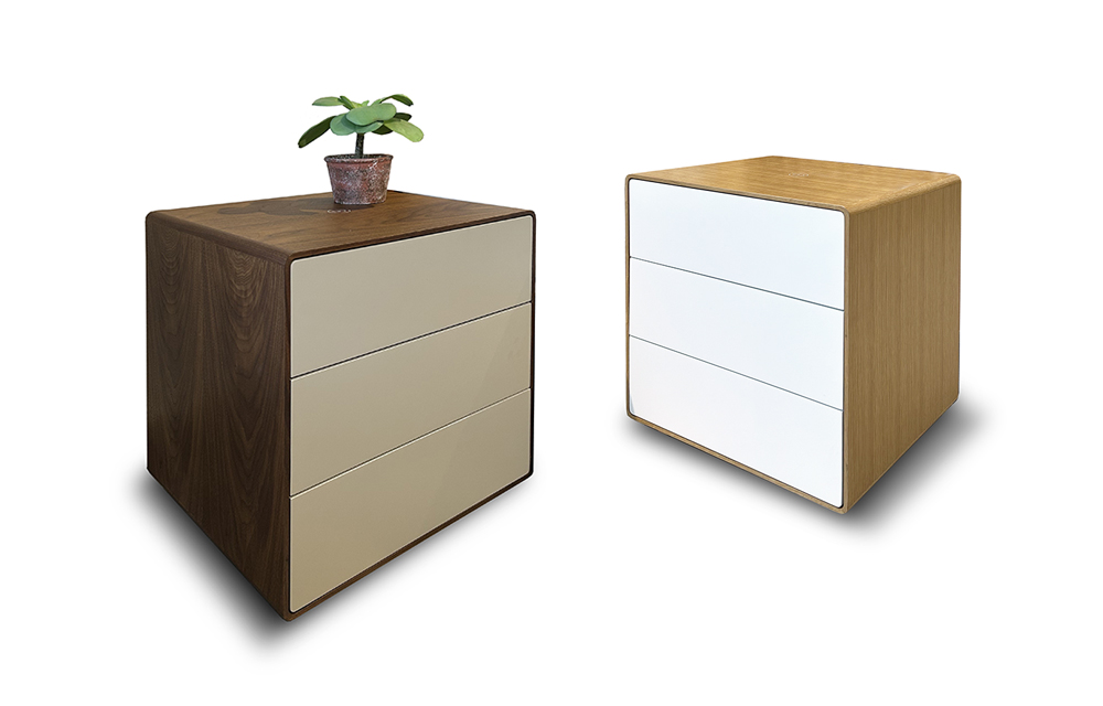 שידת לילה מודרנית בקווים נקיים הכוללת 3 מגירות ומשטח הטענה למכשירים סלולרים מתאימים. בגוון אלון טבעי בשילוב לכה לבנה או אגוז אמריקאי בשילוב לכה אפורה