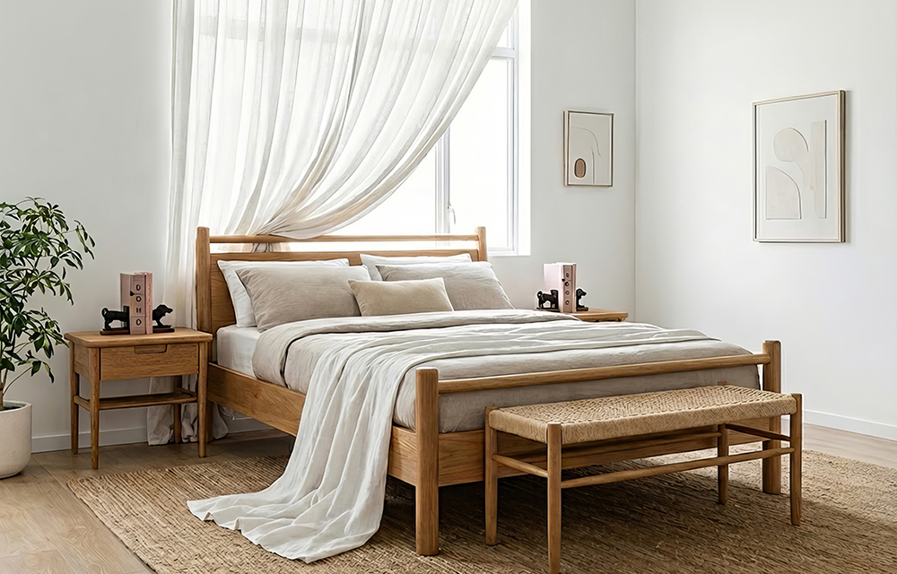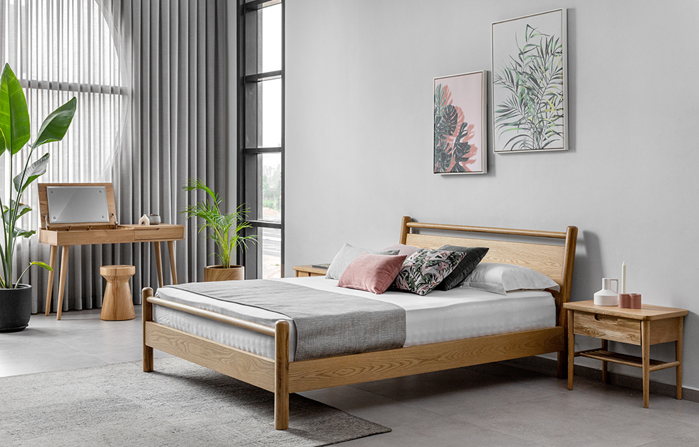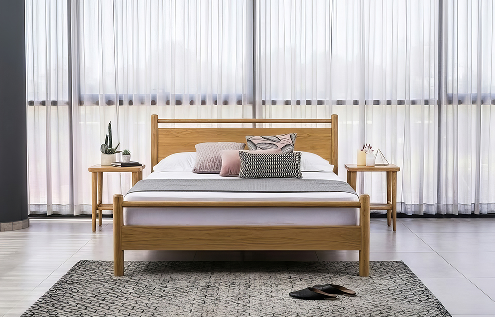 מיטה בגוון אלון טבעי עם רגלי עץ מעוגלות וראש מיטה עם קורות עץ אופקיות.