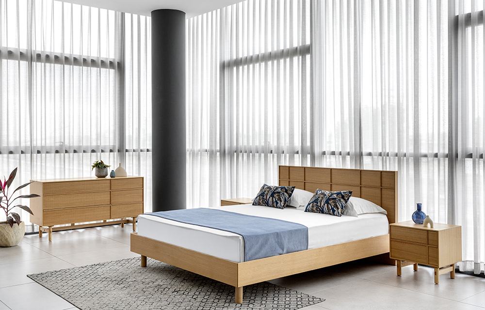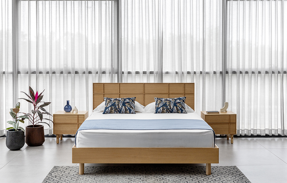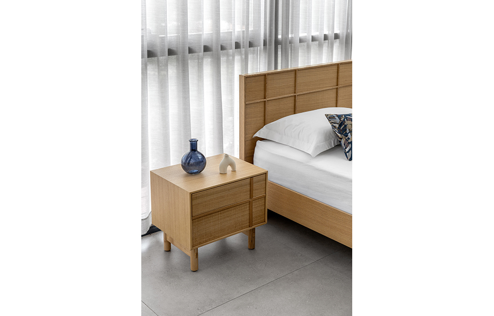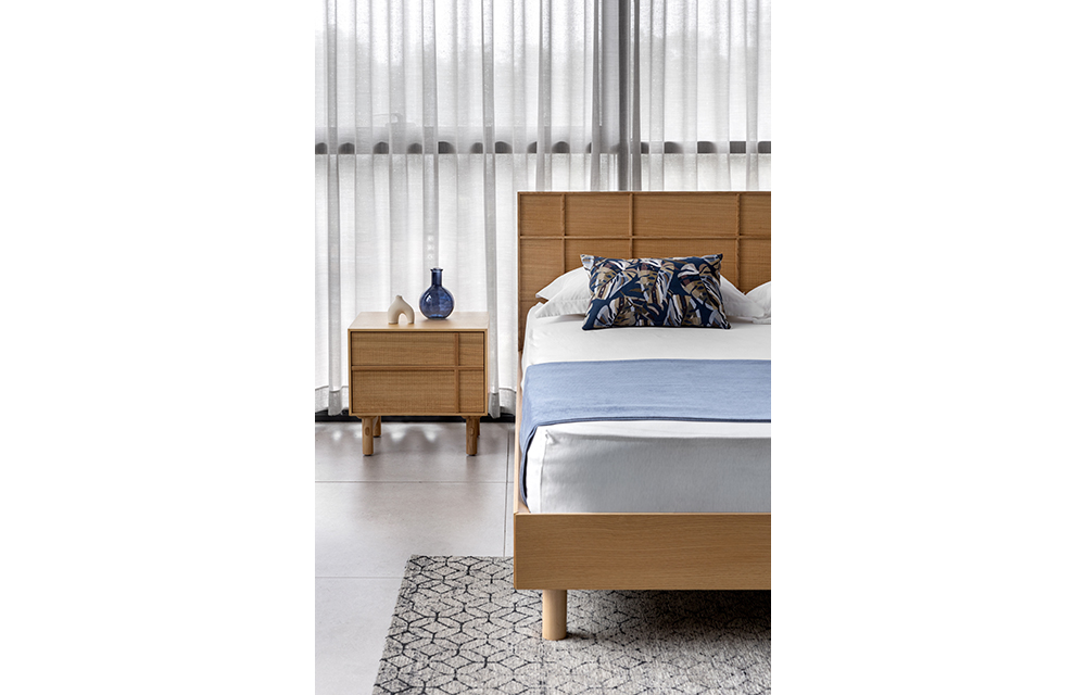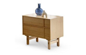 שידת לילה בדיגום מנימליסטי המאופיינת בדוגמת פורניר אלון מוברש ופסי עץ, בעלת 2 מגירות. בגוון אלון טבעי/ אגוז אמריקאי לבחירה.